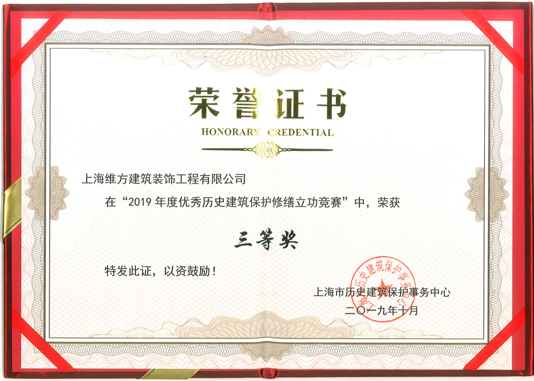 公司取得上海市2019年度優(yōu)秀歷史建筑保護(hù)修繕立功競(jìng)賽三等獎(jiǎng)
