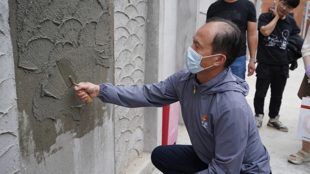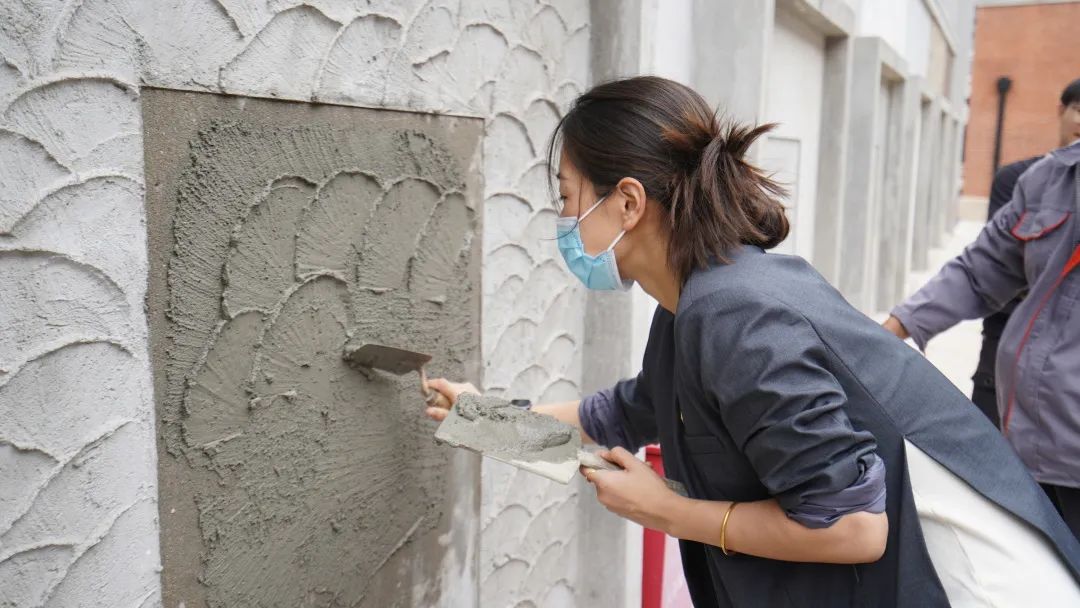 歷史建筑的修繕離不開工匠們的辛勤耕耘,他們以嫻熟技藝重現(xiàn)建筑細節(jié),以精工匠心重綻建筑神采?;顒蝇F(xiàn)場,來自維方公司的工匠師傅為大家展示了魚鱗拉毛工藝。調制漿料,手腕一轉,著力一刷,魚鱗輪廓就這樣完成了,極具弧形美感。在場的參觀者們嘖嘖稱奇,在老師傅的教導下,大家也化身為工匠學徒,體驗了一回修繕技藝的實操過程,新鮮、有趣又有意義。