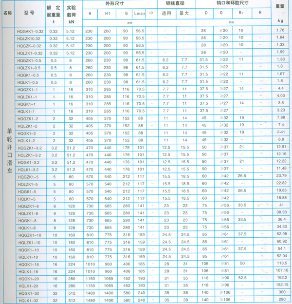產品規(guī)格從0.03-320噸,輪系從單輪至十輪,吊具有吊鉤,鏈環(huán),吊環(huán),吊梁四種,可供用戶選擇。